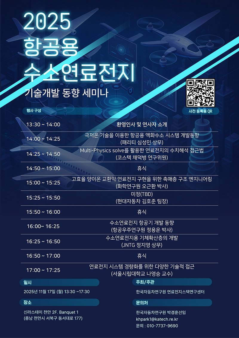 연료전지스택연구센터에서 주최/주관하는 ‘2025 항공용 수소연료전지 기술개발 동향 세미나’가11월17일(월), 천안 신라스테이에서 개최됩니다.
