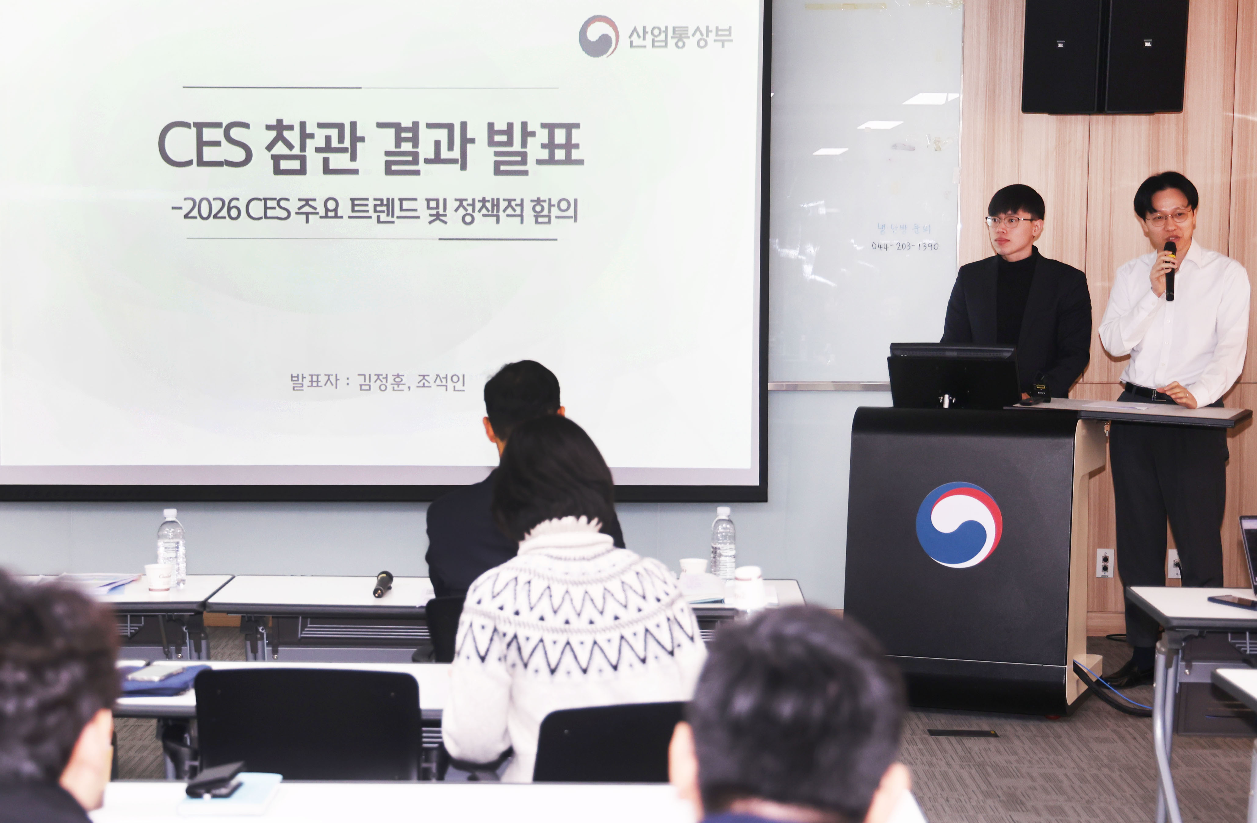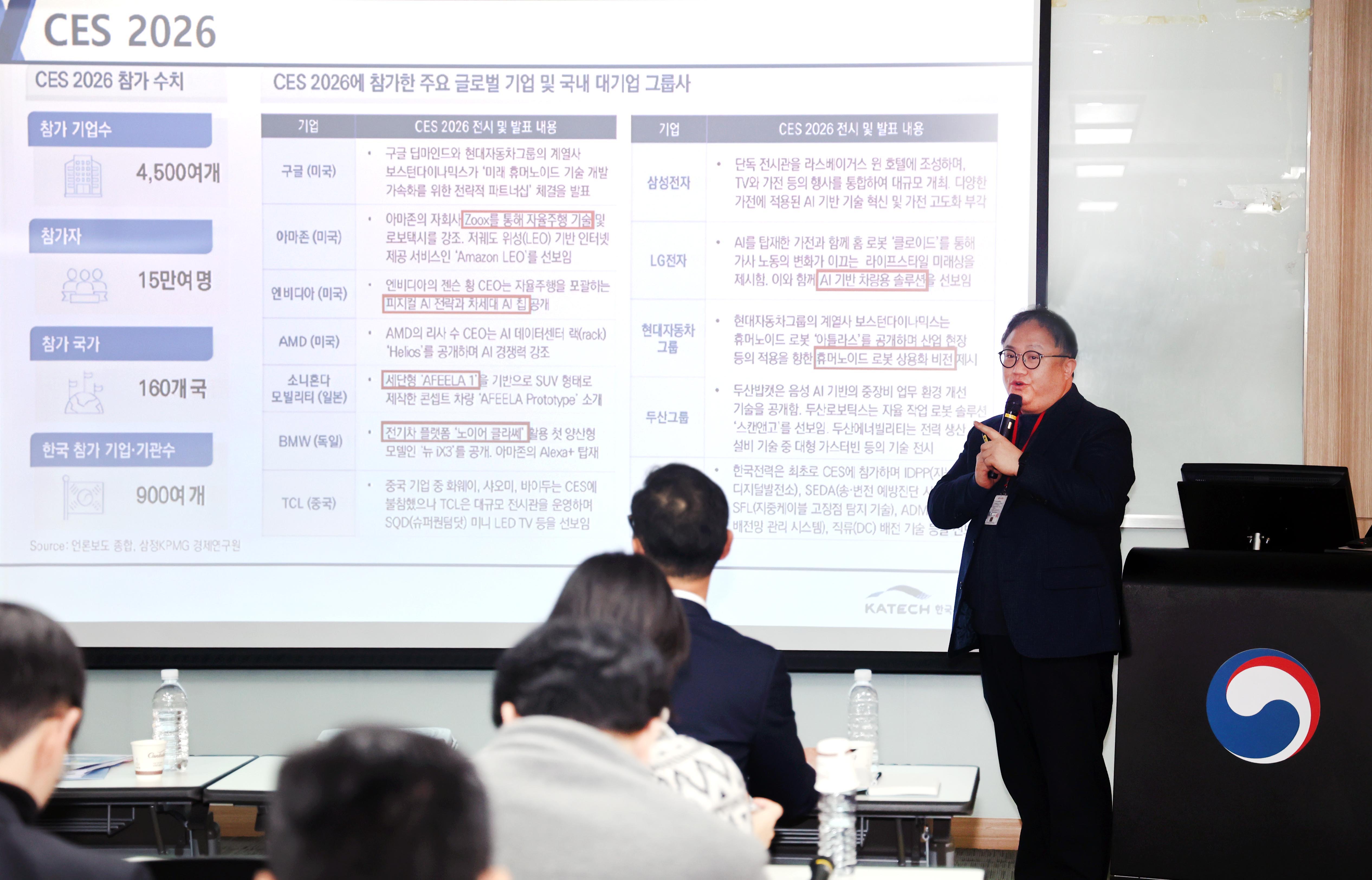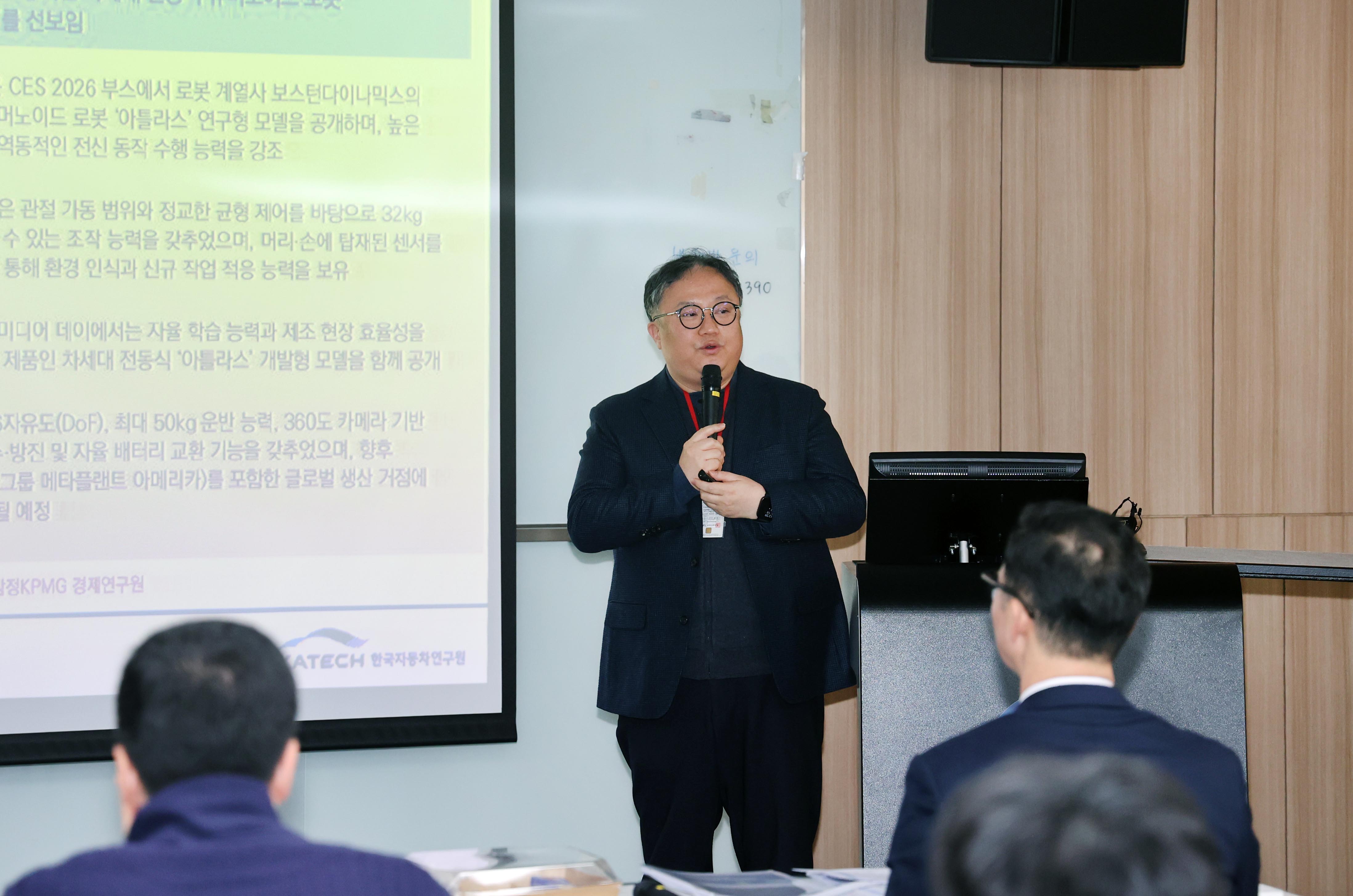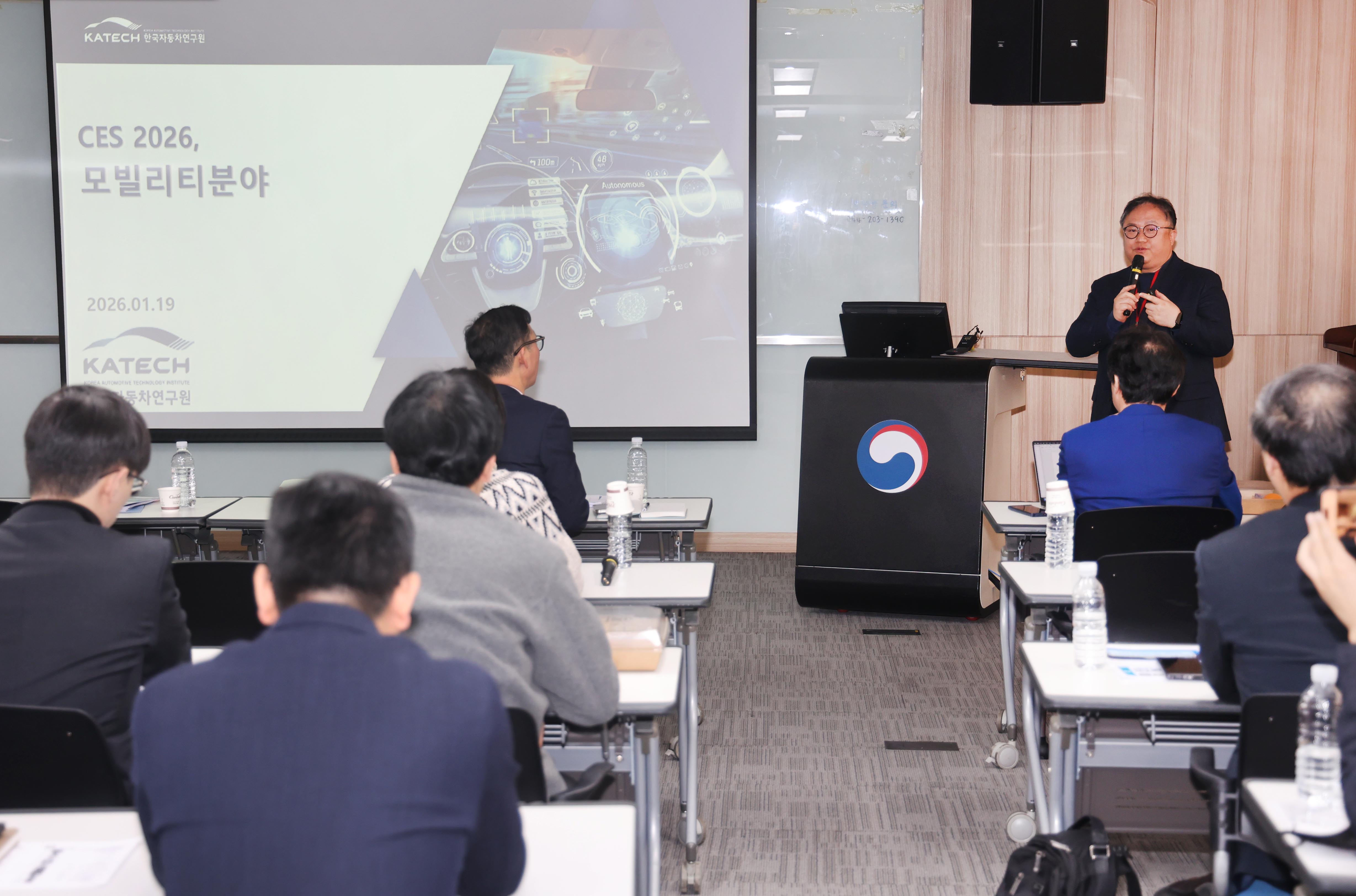 곽수진 슬롯사이트 AI·자율주행기술연구소장(직무대행)은 2026. 1. 19(월) 10:00 세종시 산업통상부 대회의실에서 김성열 산업부 산업기반실장, 유재호 디스플레이가전과장, 손재권 The MiilK 대표, 한국전자기술연구원, 한국전자정보통신산업진흥회, 한국디스플레이산업협회, 슬롯사이트, 한국산업기술기획평가원과 CES 참관자 및 발표자, 산업부 직원 등 80여명이 참석한 가운데 ‘지난 1.6~9일 미국 라스베이거스에서 개최된 2026 CES 참관 결과를 산업통상부 및 유관기관간 공유하고, 향후 산업·기술·통상 정책 검토에 활용 가능한 시사점을 도출’하기 위해 열린 「산업통상자원부와 슬롯사이트 등 유관기관 CES 참관 결과 공유 세미나」에 참석하여, “CES 2026 모빌리티분야”에 관해 발표를 하였다.