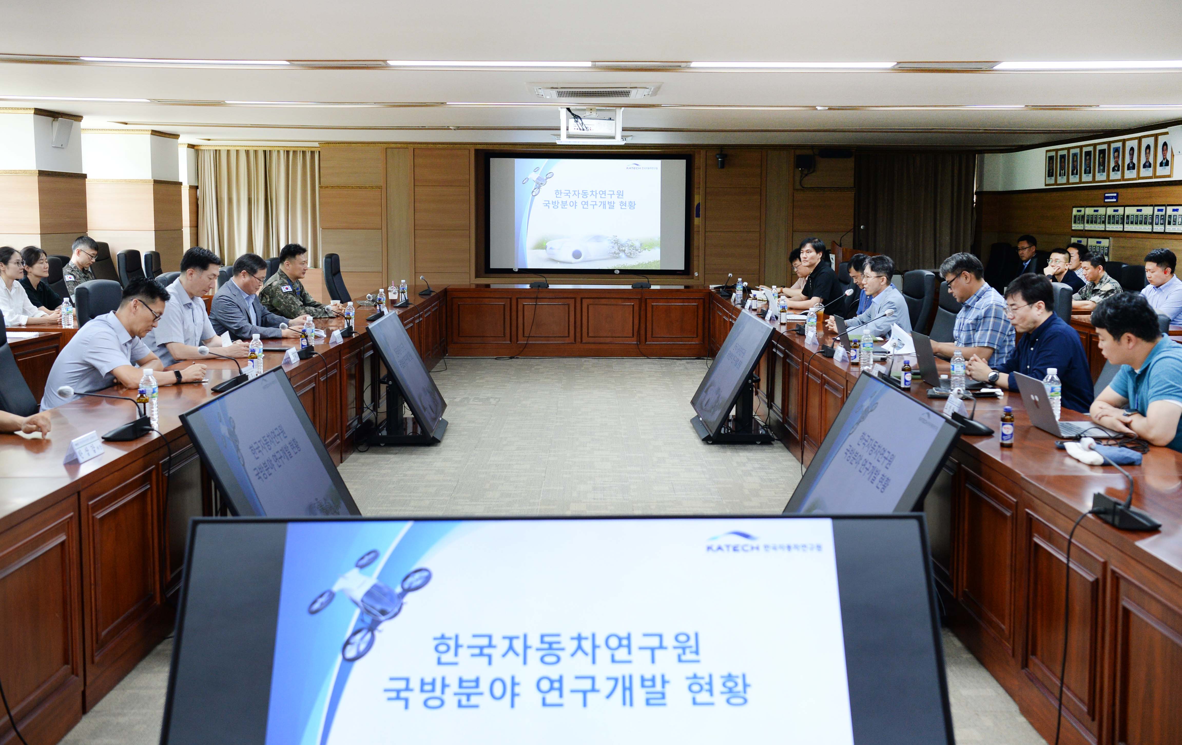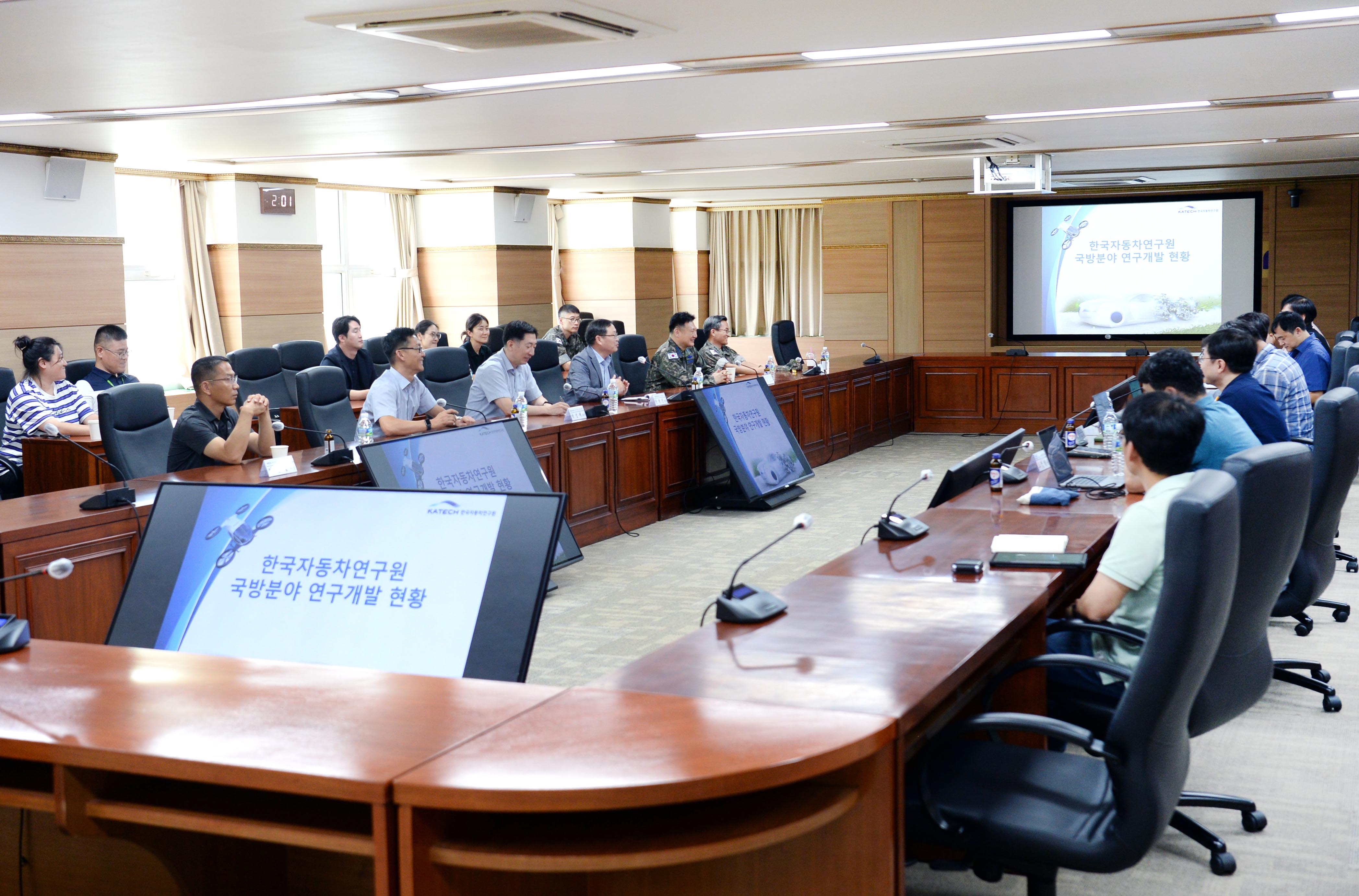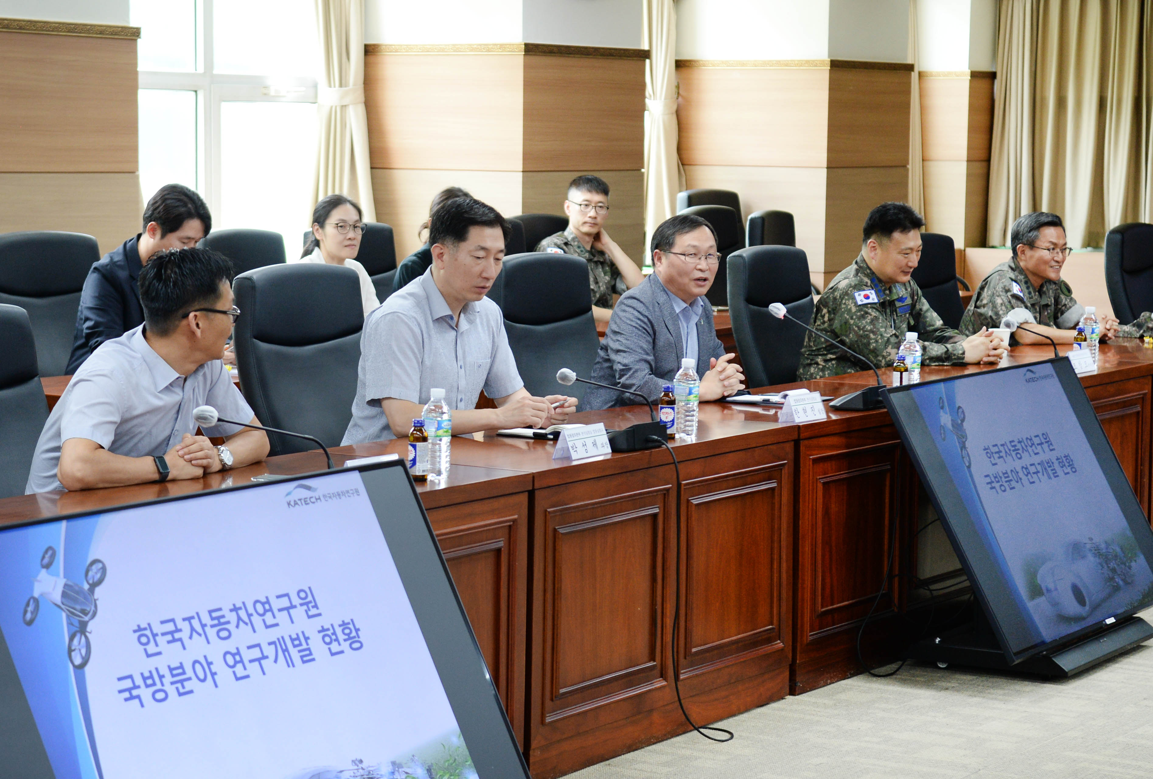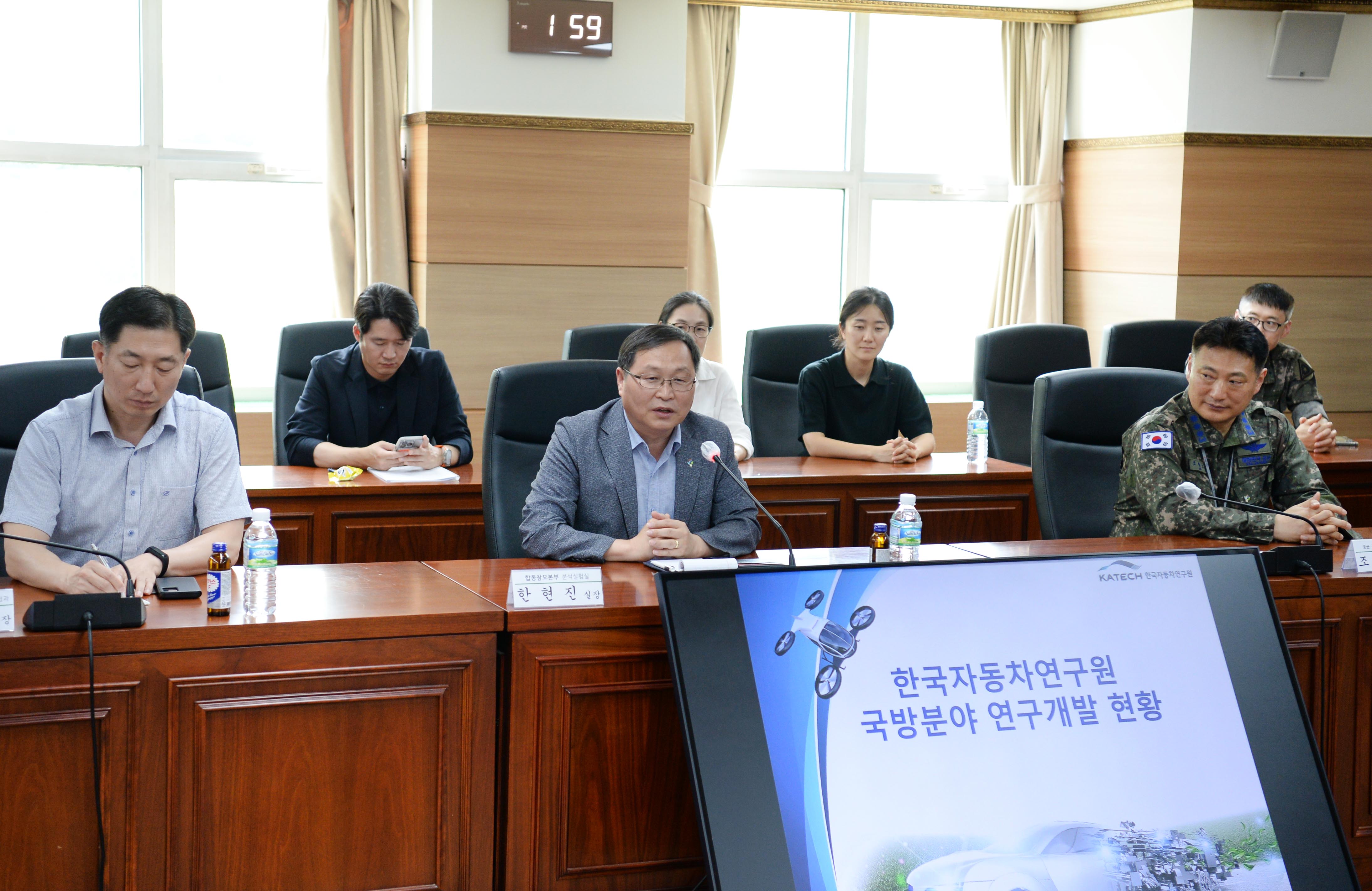 슬롯사이트(진종욱 원장)은 2025. 7. 1(화) 13:30 슬롯사이트 천안 본원을 방문한 한현진 합동참모본부 분석실험실장과 박성제 합참 합동실험과장, 오동환 합참 합동MS체계관리과장, 이진용 국방부 군구조혁신담당관, 이석영 육군 기획관리참모부 미래전력소요과 중령, 박상훈 육군 교육사령부 전투실험계획/발전과장, 조창모 공군 전투발전단 분석평가센터장, 손성진 공군 기획참모부 전력기획과장, 박진아 방위사업청 방위산업고도화지원과장, 고대중 국방기술진흥연구소 선암연구원, 한상갑 해병대 전투모의분석센터 분석평가처장 등 국방혁신 4.0 미래 군구조 기준설계 관련 국방부, 합참, 육군, 해군, 공군, 해병대 전투실험 담당자 30여명과 정상빈 첨단기동체계사업부장 등 한자연 관계자가 참석한 가운데 ‘모빌리티 분야 시뮬레이션 성과를 미래 군구조 기준 설계에 반영’하기 위한 “하이브리드(차량형 시뮬레이션)성과, HILS를 이용한 주행제어기술, 자율주행 기술 시뮬레이션, 달 탐사 및 플랫폼 개발 시뮬레이션 등” 연구원의 ‘모빌리티 분야 시뮬레이션 성과’를 공유하고, 자율주행 Lab, 능동안전연구 HILS, Ex Lab 등 연구시설을 견학하였다.