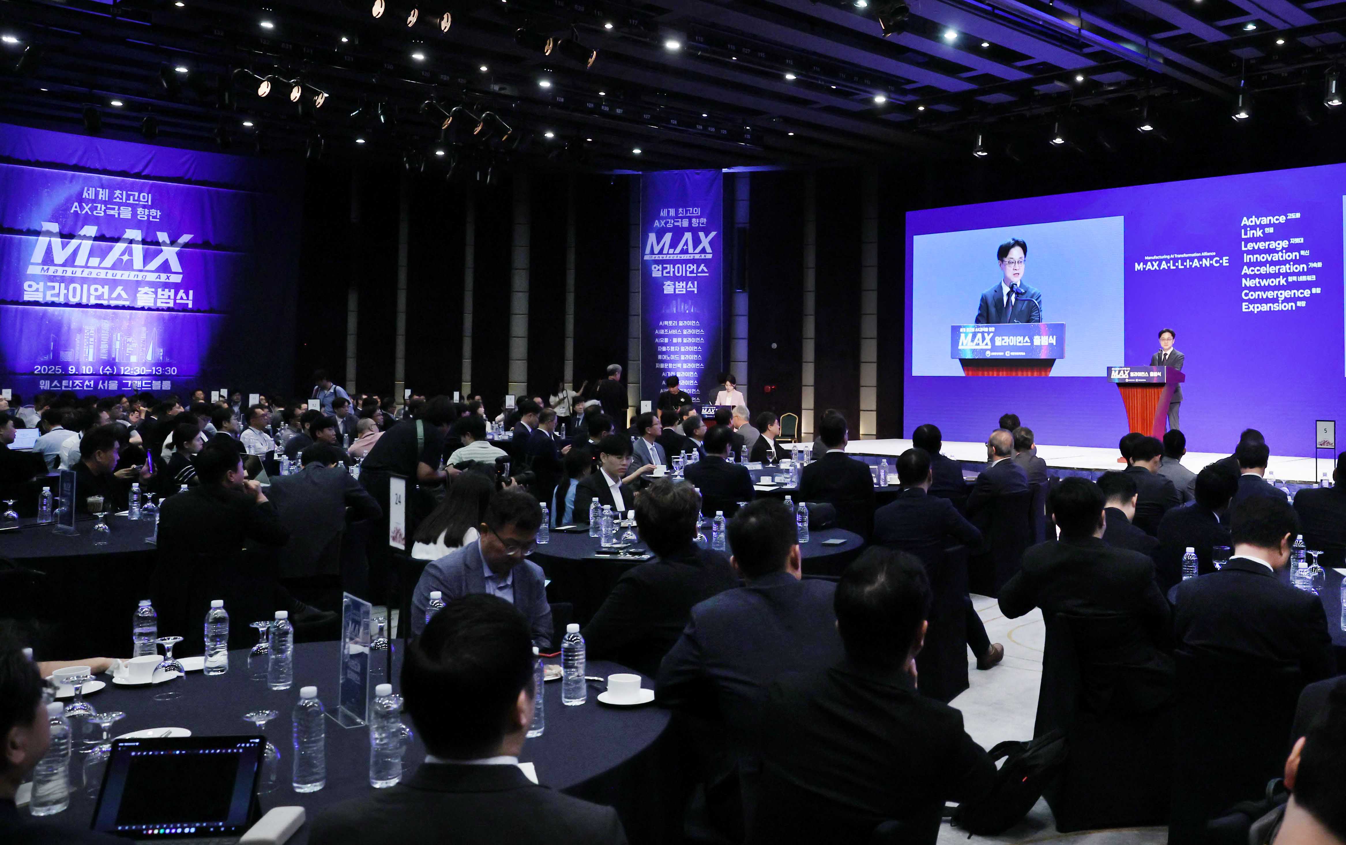 임광훈 슬롯사이트 부원장은 2025. 9. 10(수) 13:00 서울 소공동 웨스틴조선호텔 그랜드볼룸에서 김정관 산업통상자원부 장관(공동위원장), 최태원 대한상의 회장(공동위원장), 박대준 쿠팡 대표를 비롯한 AI 팩토리, AI 제조서비스, AI 유통·물류, 자율주행차, 휴머노이드, 자율운항선박, AI 가전, AI 방산, AI 바이오, AI 반도체 등 10개 분야별 핵심기업, 출연기관 및 연구소, 기업, 대학 등 관계자 약 300명이 참석한 가운데 ‘2030년 제조 AX 최강국’을 위해 1,000개 이상의 기업·대학 등이 참여한 「제조 AX 얼라이언스 출범식」에 참석하였다.