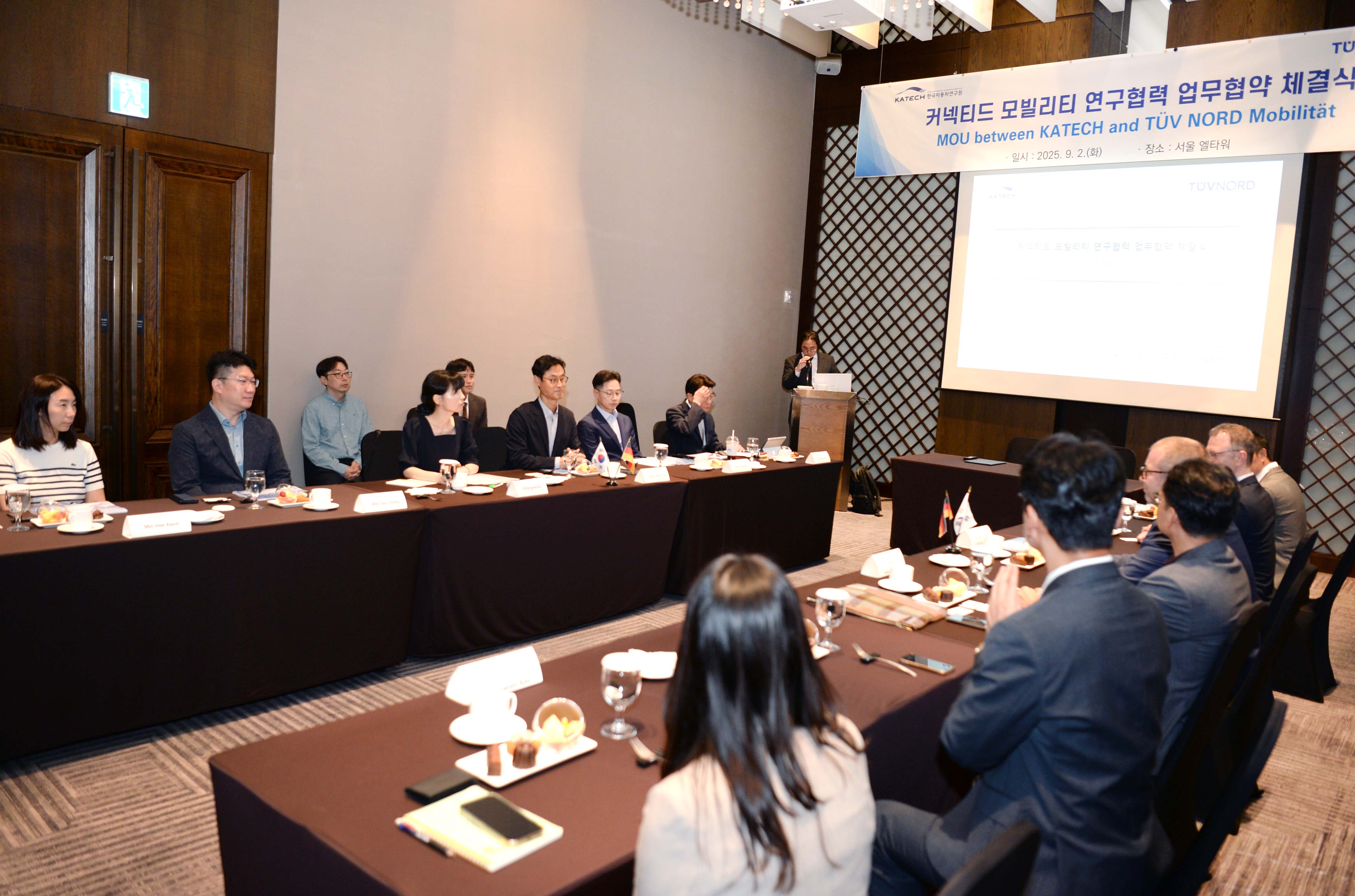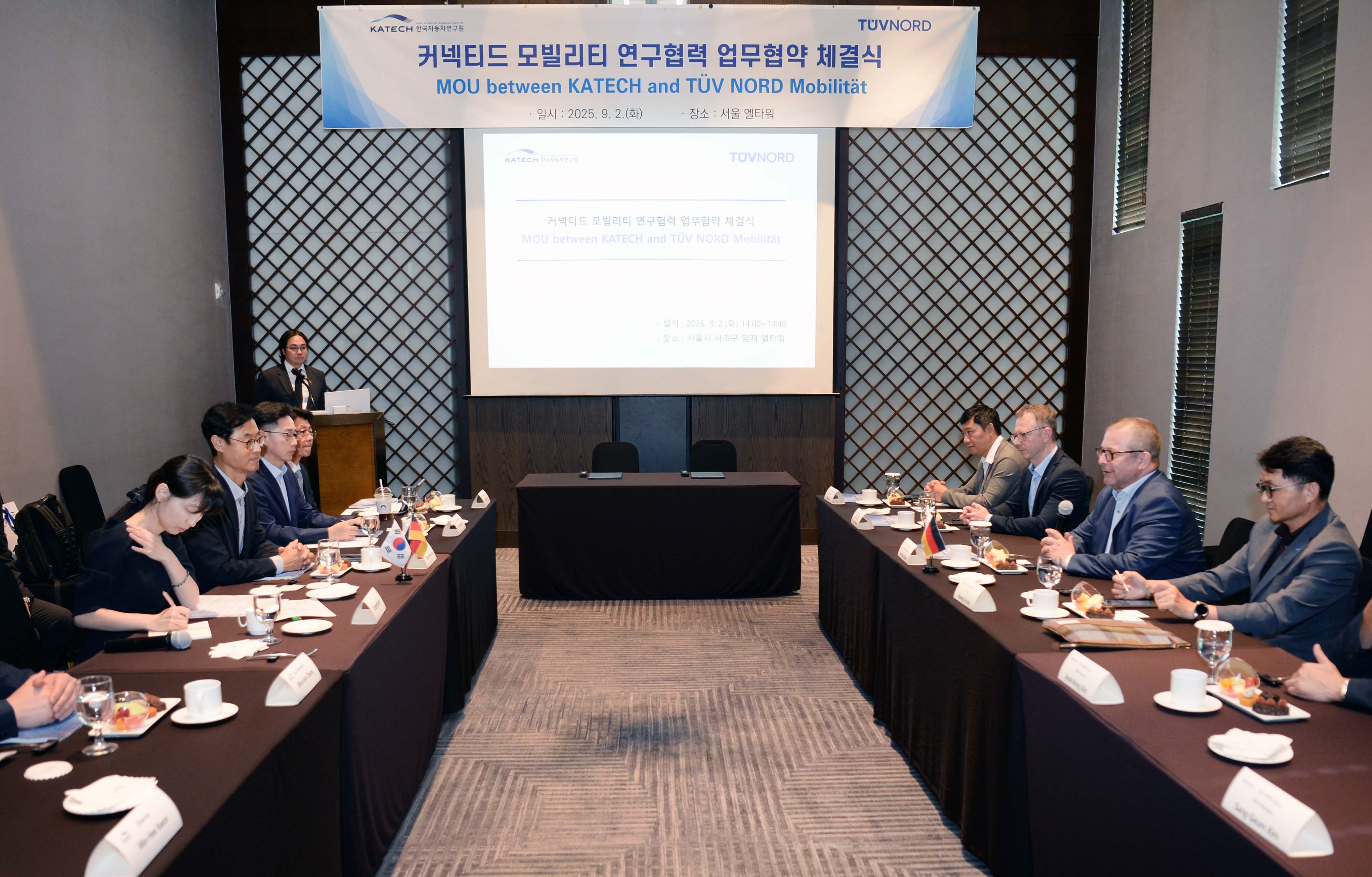 진종욱 슬롯사이트장은 2025. 9. 2(화) 14:00 서울 서초구 양재동 엘타워에서 “독일의 글로벌 시험·검사·인증 기관인 TUV NORD(회장 디르크 슈텐캄프)와 손잡고 커넥티드 모빌리티 산업 경쟁력 강화”를 위해 레이프-에릭 슐테(Leif-Erik Schulte) TUV NORD Mobility 부사장과 「커넥티드 모빌리티 연구협력을 위한 업무협약(MOU)」을 체결하고, 한자연과 TUV NORD Mobility는 커넥티드 모빌리티와 관련하여 무선통신과 사이버 보안 등 다양한 분야에서 긴밀히 협력해 나가기로 하였다.
