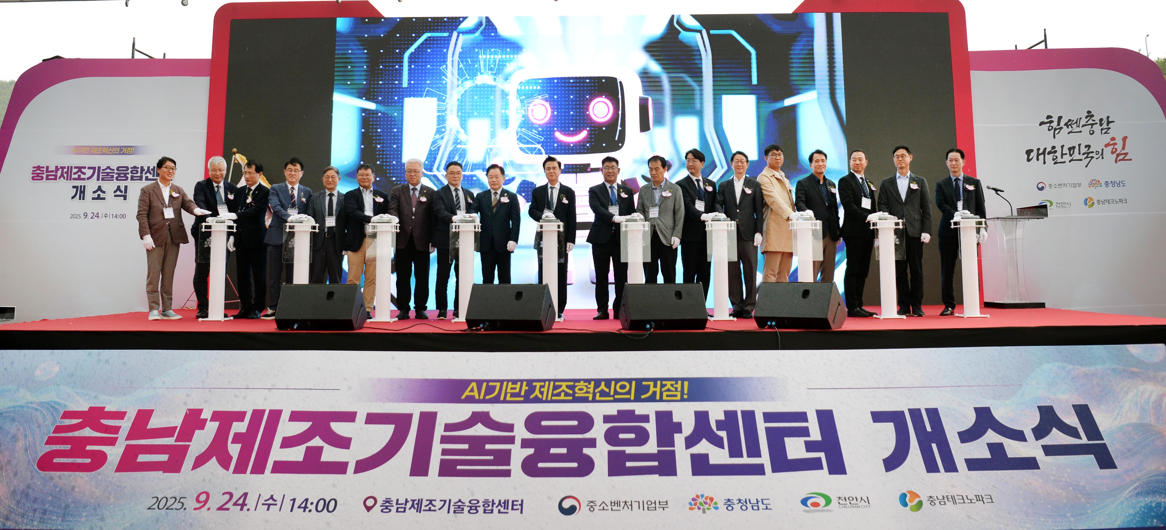 진종욱 슬롯사이트장은 2025. 9. 24(수) 14:00 충남 천안시 충남제조기술융합센터에서 김태흠 충남도지사, 김석필 천안시 부시장, 원종민 천안시 서북구청장, 권순재 중기부 지역기업정책관, 김윤우 충남중기청장, 오인철 충남도의회 제2부의장, 안광현 스마트제조혁신추진단장, 서규석 충남TP 원장, 박성영 충남ICT융합산업협회장, 임경호 공주대 총장, 강성광 삼성디스플레이 글로벌인프라총괄센터장, 박세국 현대슬롯 아산공장장, 우창완 용산 사장, 이태영 TNS솔루션 대표를 비롯한 정부 및 도·시 공무원과 산학연 관계자 등 300여명이 참석한 가운데 열린 「충남제조기술융합센터 개소식」에 참석하여, “힘쎈충남! AI 제조혁신!”이란 슬로건의 버튼 터치 퍼포먼스를 가진 후 ‘제조기술융합센터 테스트베드 구축 장비 시연공간 및 슬롯사이트 충남 천안·아산 강소특구캠퍼스의 교육장과 기업 입주 공간시설’을 둘러보았다.