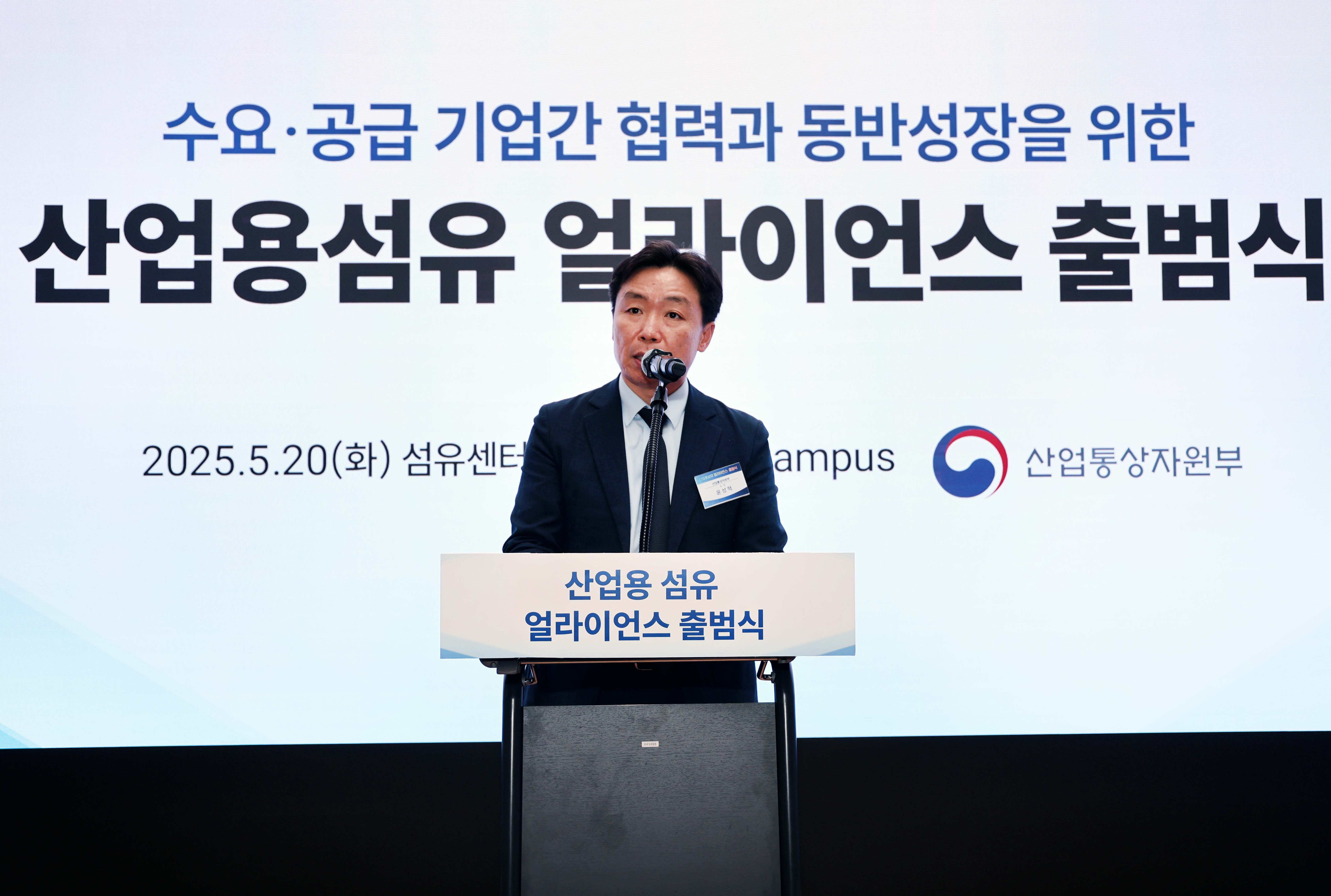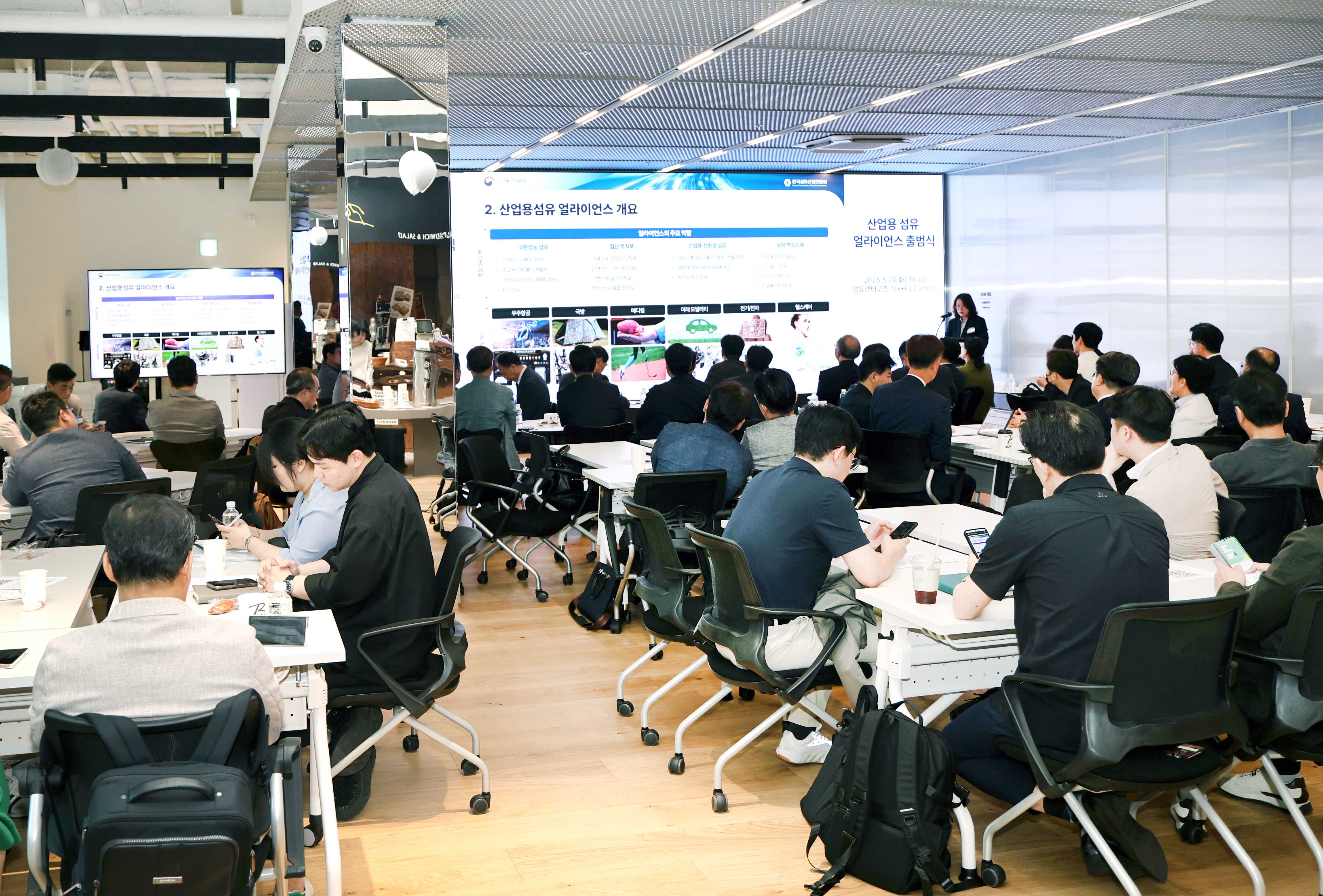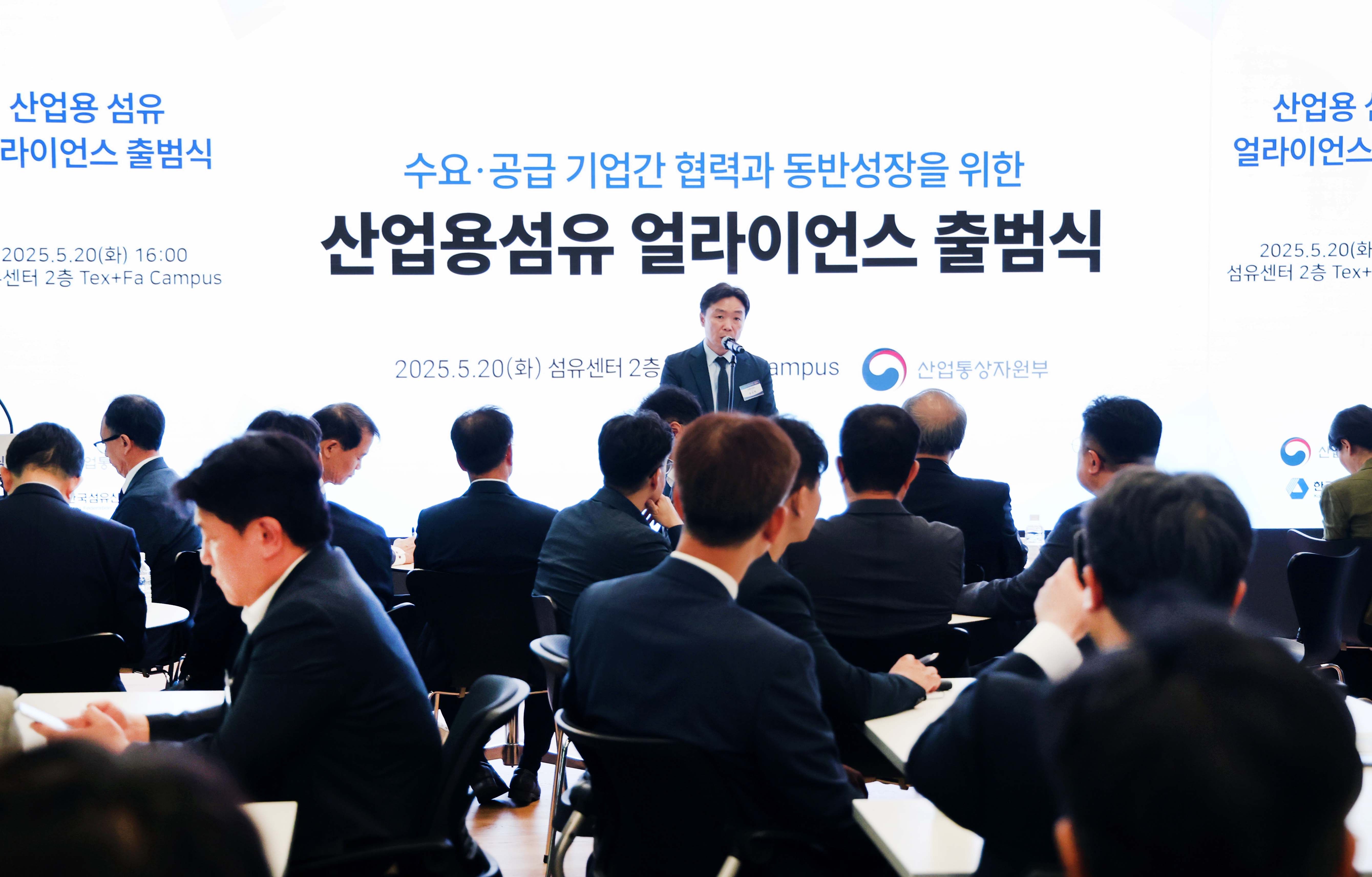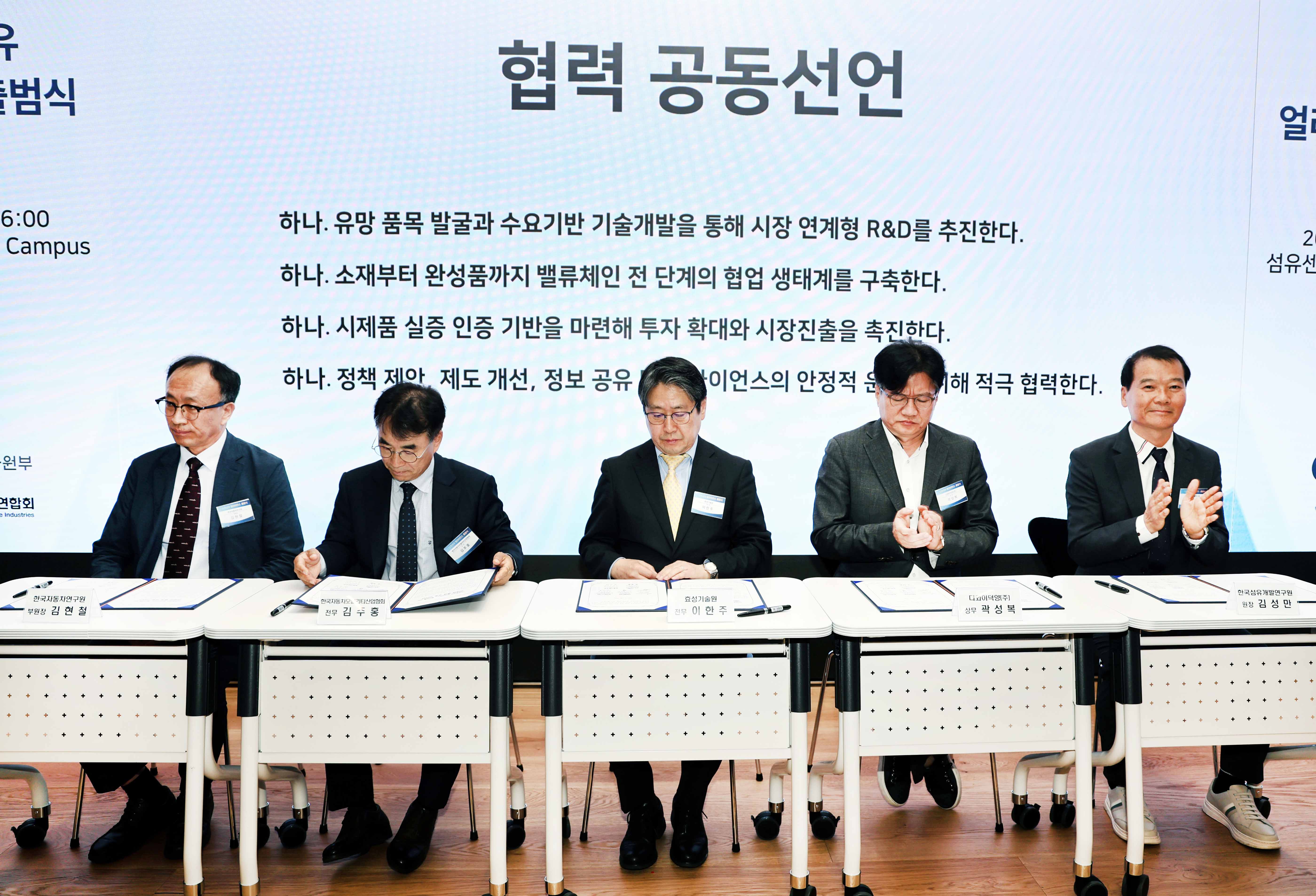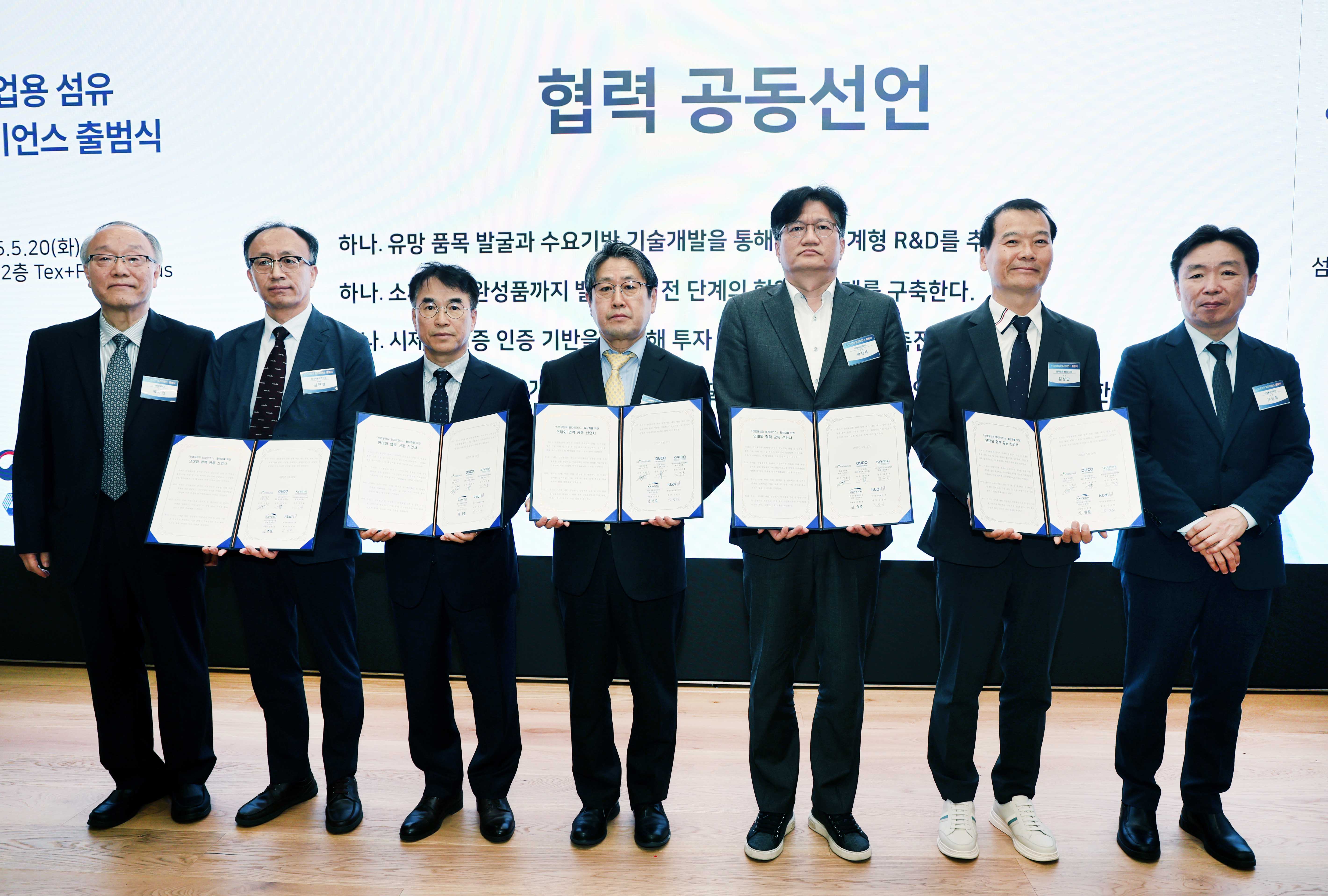 슬롯사이트(진종욱 원장)은 2025. 5. 20(화) 16:00 서울 섬유센터 2층 텍스파 캠퍼스에서 윤성혁 산업부 첨단산업정책관, 백두현 충남대 명예교수와 국내 산업용섬유 제조기업, 현대슬롯 등 수요기업, 시험·연구기관, 협·단체 등 관계자 100여명이 참석한 가운데 ‘산업용 섬유 분야의 수요‧공급기업, 시험연구기관 등 주체 간 협업과 기술 혁신 역량을 하나로 모으기’ 위한 「산업용 섬유 얼라이언스 출범식」에 참석하여, 김현철 슬롯사이트 부원장, 김성만 한국섬유개발연구원장, 곽성복 다와이덕양(주) 상무, 이한주 효성기술원 전무, 김주홍 한국슬롯모빌리티산업협회 전무 등 5개 기관 대표가 “산업용섬유 공급망 협력 MOU 체결” 공동선언식을 가졌다.