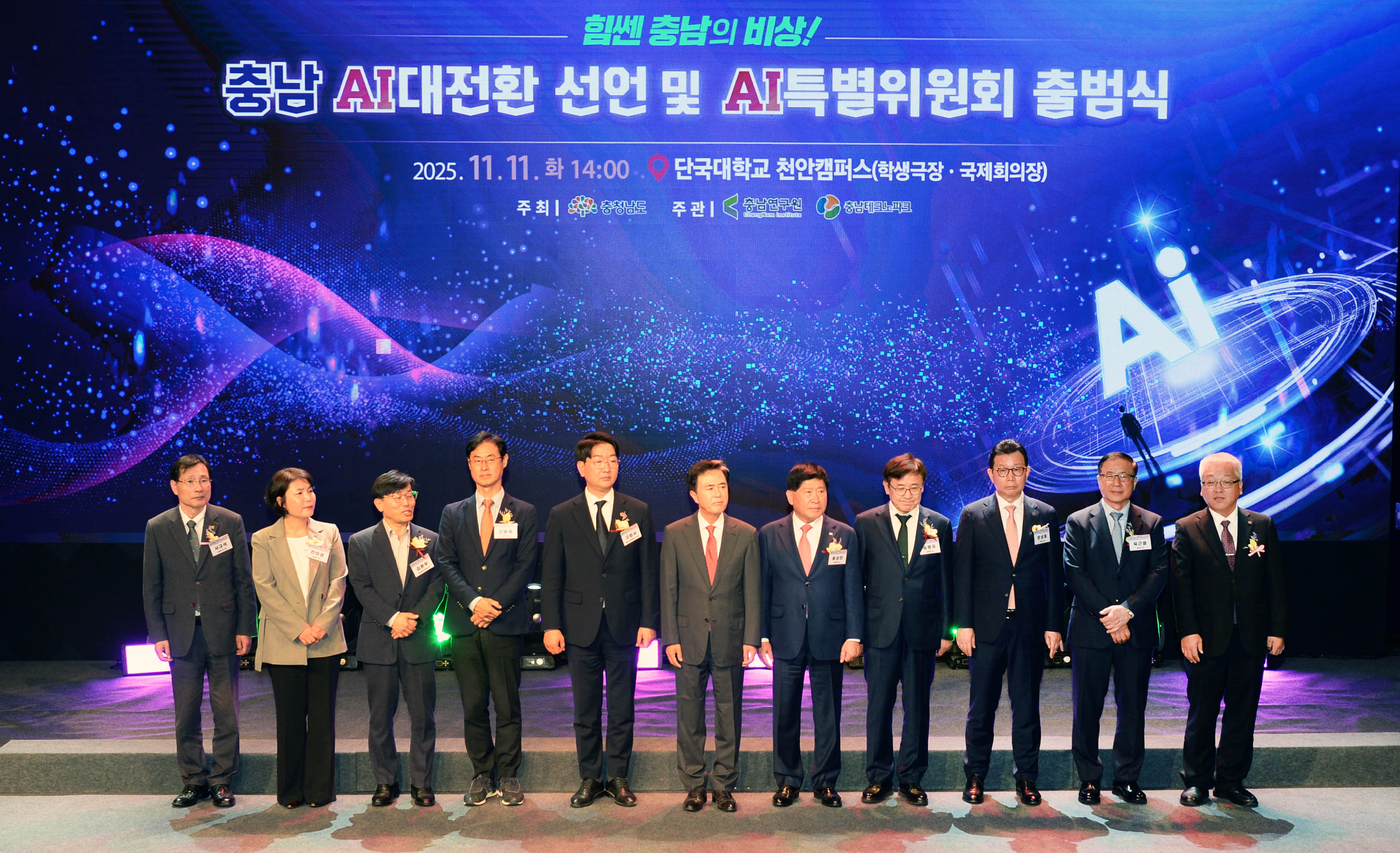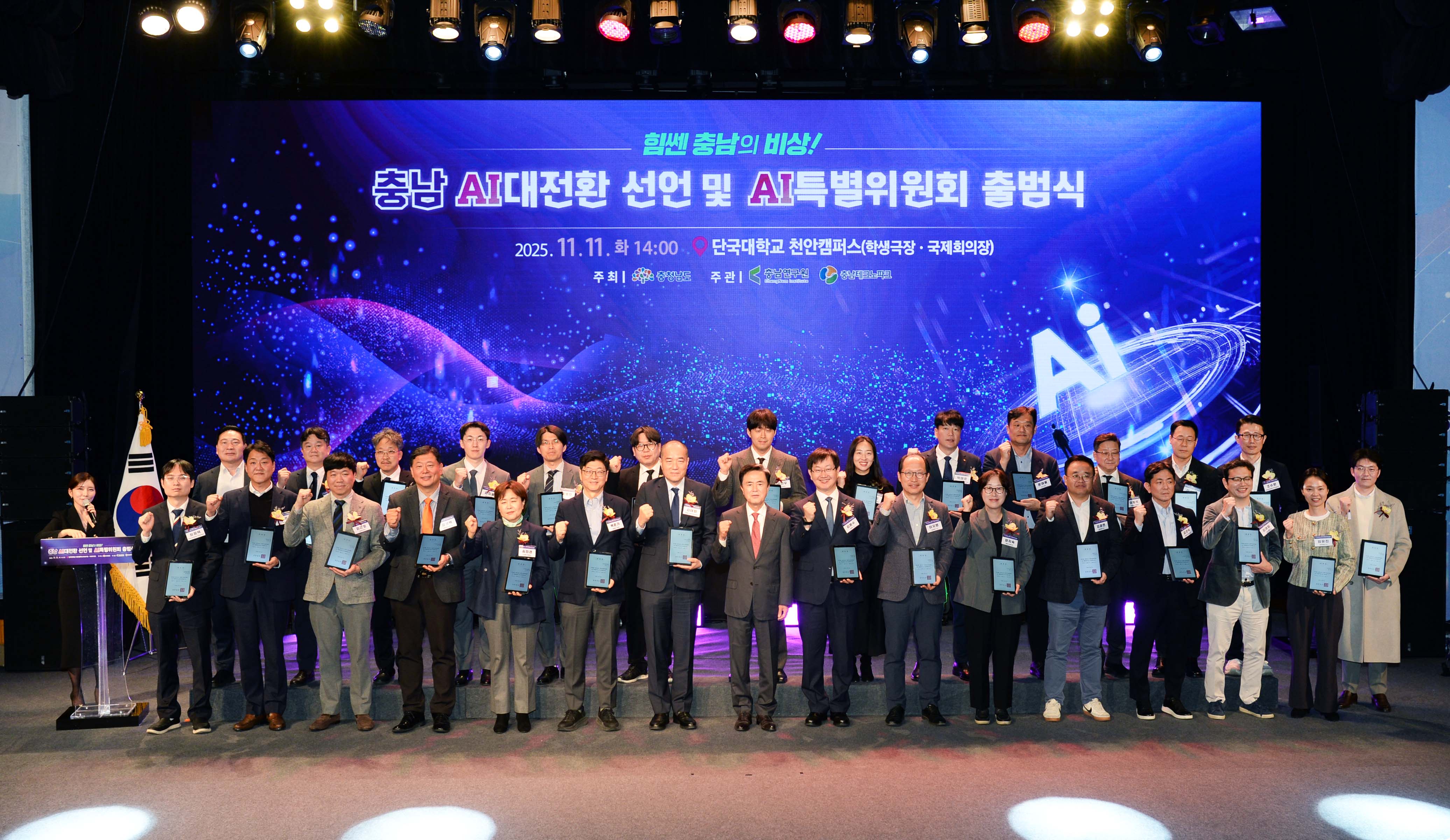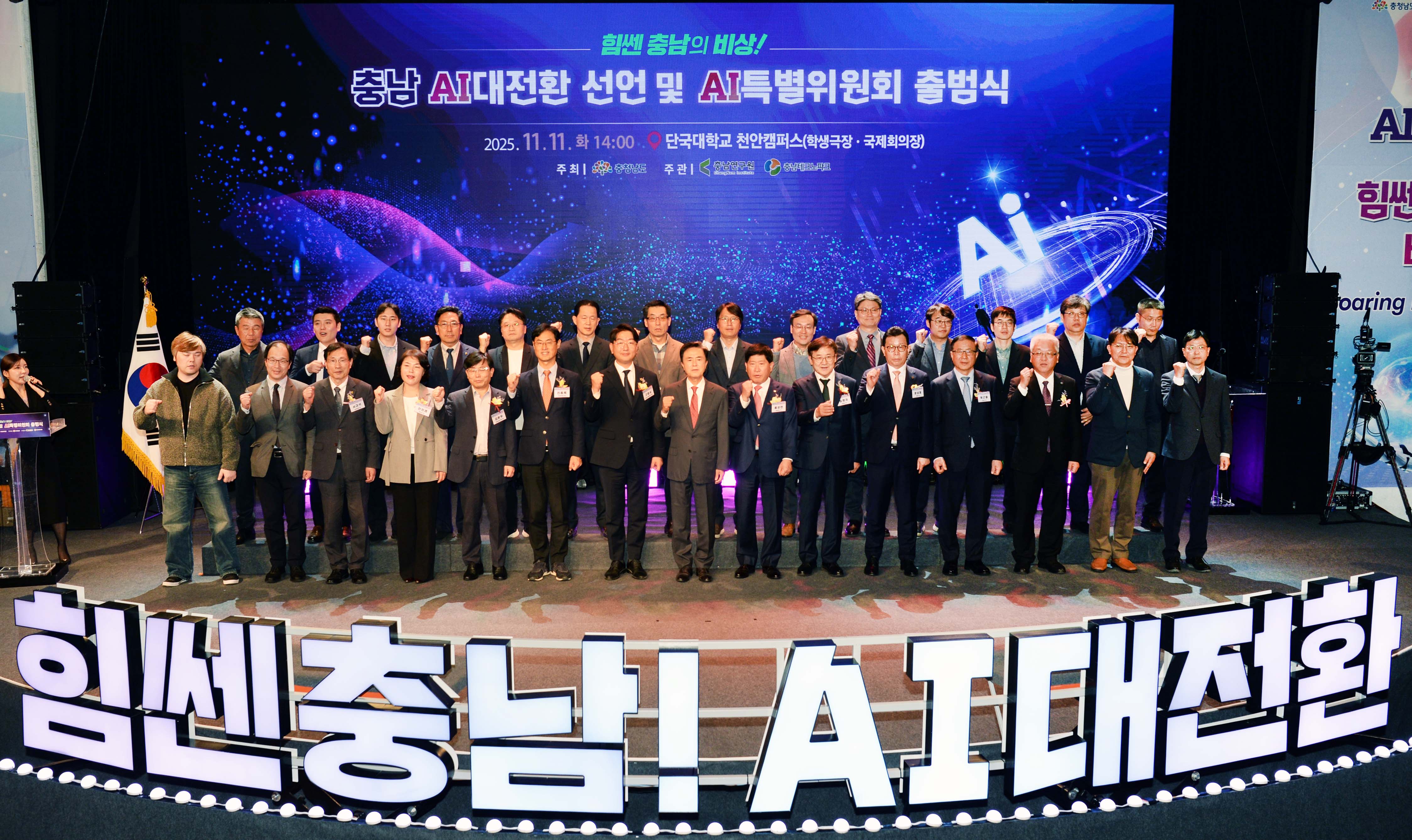 진종욱 슬롯사이트장은 2025. 11. 11(화) 14:00 단국대학교 천안캠퍼스 학생극장에서 김태흠 충남 도지사, 홍성현 충남도의회 의장, 전희경 충남연구원장, 서규석 충남테크노파크 원장, 김택수 한국생산기술연구원 부원장, 김윤우 충남지방중소벤처기업청장, 송병국 순천향대학 총장, 문성제 선문대 총장, 백동현 단국대 천안부총장을 비롯한 도의회, 출연·출자기관, 연구기관 및 단체, 대학 등 관계자 300여명이 참석한 가운데 열린 「충청남도 AI대전환 선언 및 AI특별위원회 출범식」에 참석하여, 슬롯사이트의 ‘디지털 트윈, AI 활용 친환경 중소형 선박 실증’시연 및 전시공간을 둘러본 후 출범식에 참석하여, 충남 AI대전환 선언 세레머니 및 분야별 얼라이언스 참석자들과 기념촬영을 가졌다.