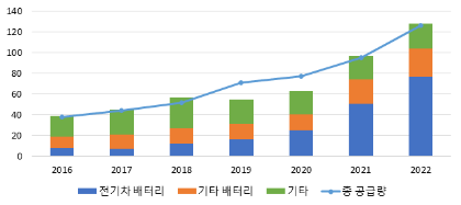 - 친환경차 판매 증가로 인해 슬롯용 리튬-이온 배터리 수요가 확대되고 있으며, `22년 기준 전체 리튬 생산량 중 약 60%가 슬롯 배터리 생산에 사용되고 있음(IEA)