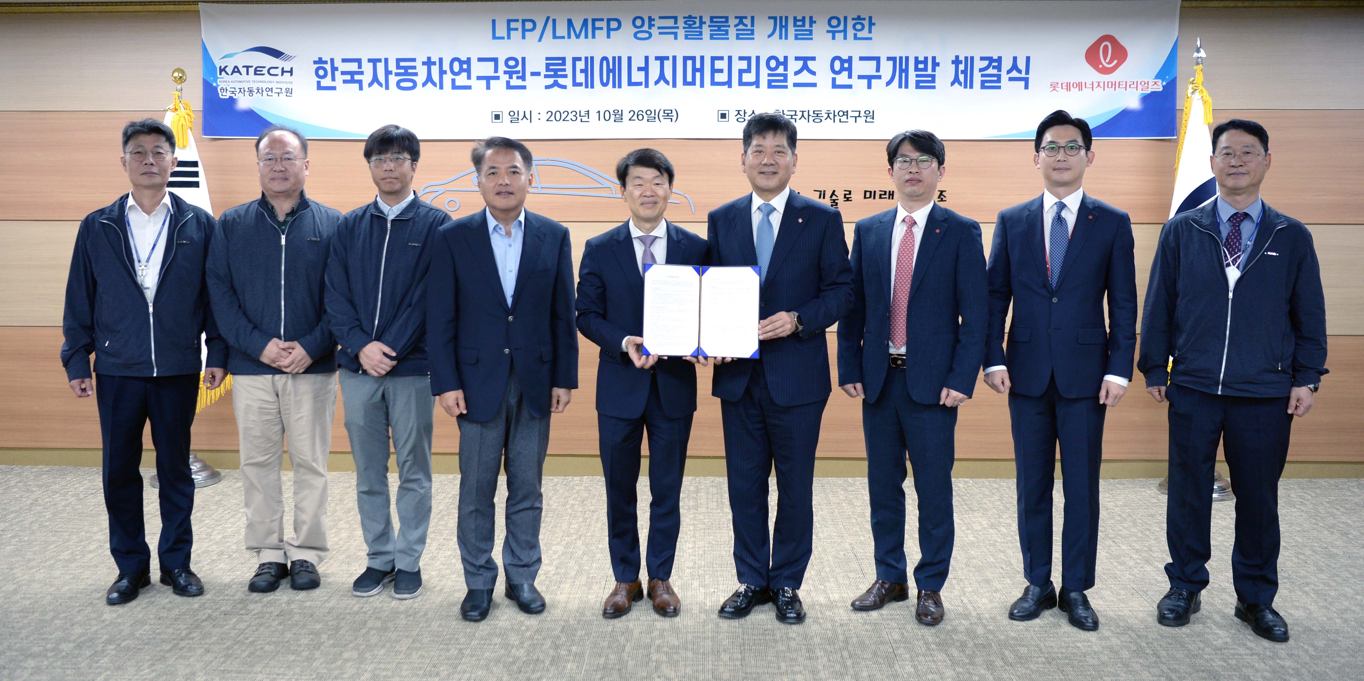 ○ 이날 체결식에는 나승식 한자연 원장과 김연섭 롯데에너지머티리얼즈 대표이사를 비롯해 한자연 한범석 섀시·소재기술연구소장, 롯데에너지머티리얼즈 류종호 전략연구담당 상무 등 양 기관 주요 관계자 10여 명이 참석했다.