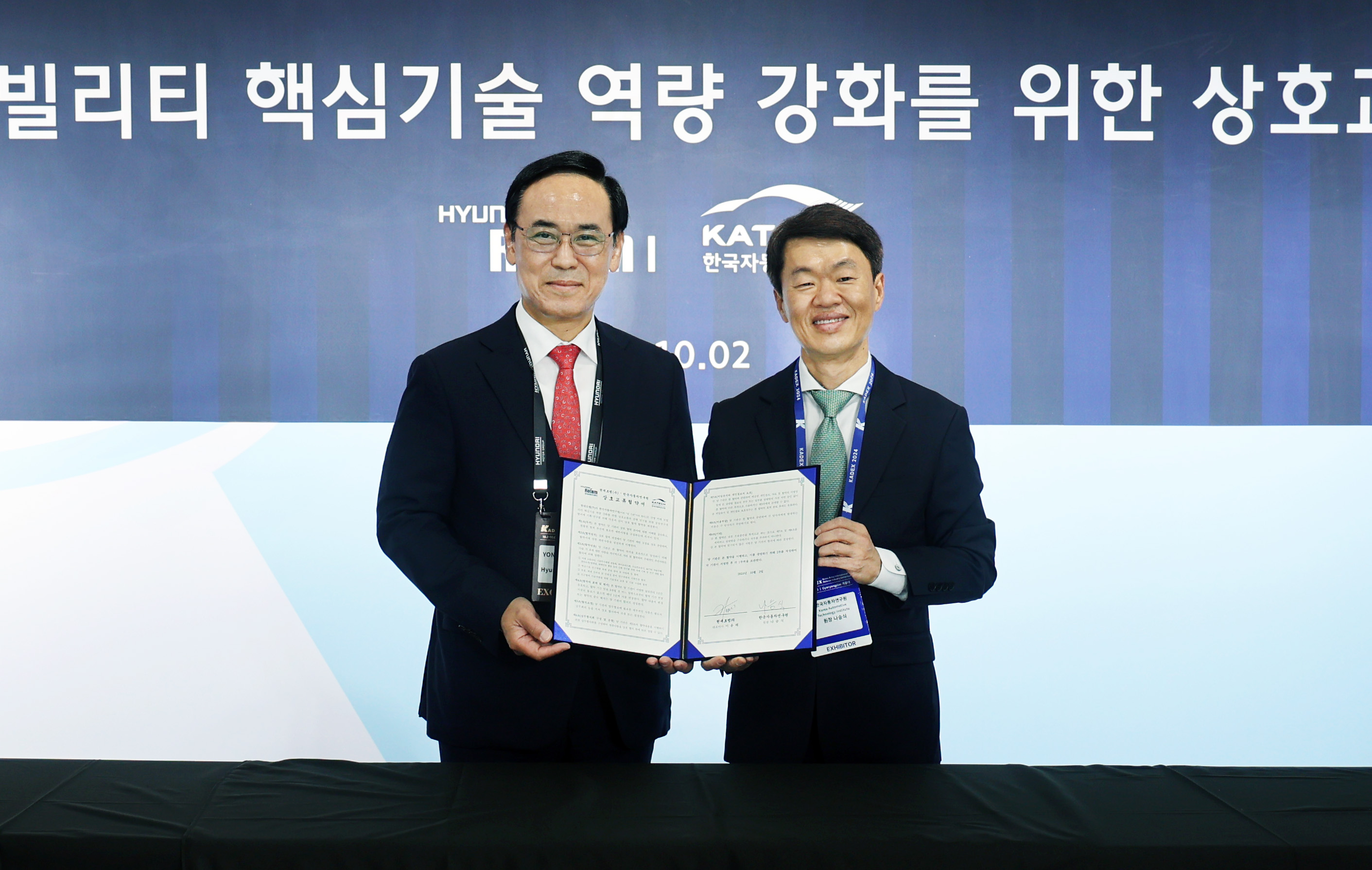 ○ 한자연은 현대로템과 2일(수) 충청남도 계룡대에서 개최한 대한민국 국제방위산업전시회(KADEX) 2024에서「국방 미래 모빌리티 핵심기술 역량 강화를 위한 업무협약」을 체결했다고 밝혔다.